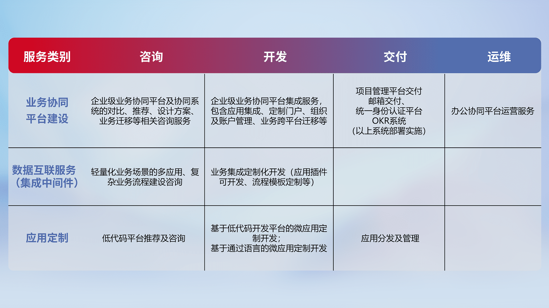针对钉钉、、企微、、、、IDaas等平台级产品提供产品的规划、、、、方案、、交付、、、定制化开发等服务,,实现如统一协同办公、、、、智能客户服务、、、、混合会议管理、、、、智能数据查询、、、等业务场景,,,,实现数字化转型。。。